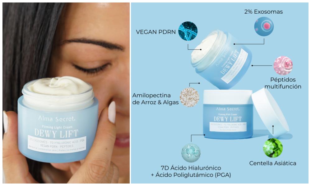 Dewy Milk combina activos avanzados como exosomas, péptidos, ácido hialurónico, ceramidas, amilopectina de arroz y algas, además de ingredientes que ayudan a suavizar la textura, afinar poros y reforzar la barrera cutánea.